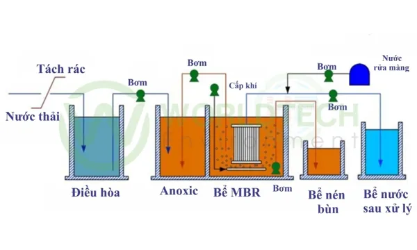 Nguyên lý hoạt động: Kết hợp xử lý sinh học hiếu khí và lọc màng (Microfiltration/Ultrafiltration). Nước thải đi qua màng lọc để tách hoàn toàn bùn và vi khuẩn, cho nước đầu ra trong suốt, có thể tái sử dụng.